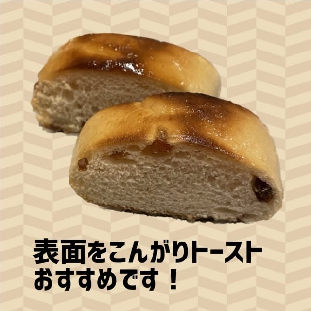 シロップ漬けのドライフルーツを練りこんで焼き上げたこっぺぱんの上に、溶かしバターを塗り、最後に雪のようなパウダーシュガーで仕上げました。